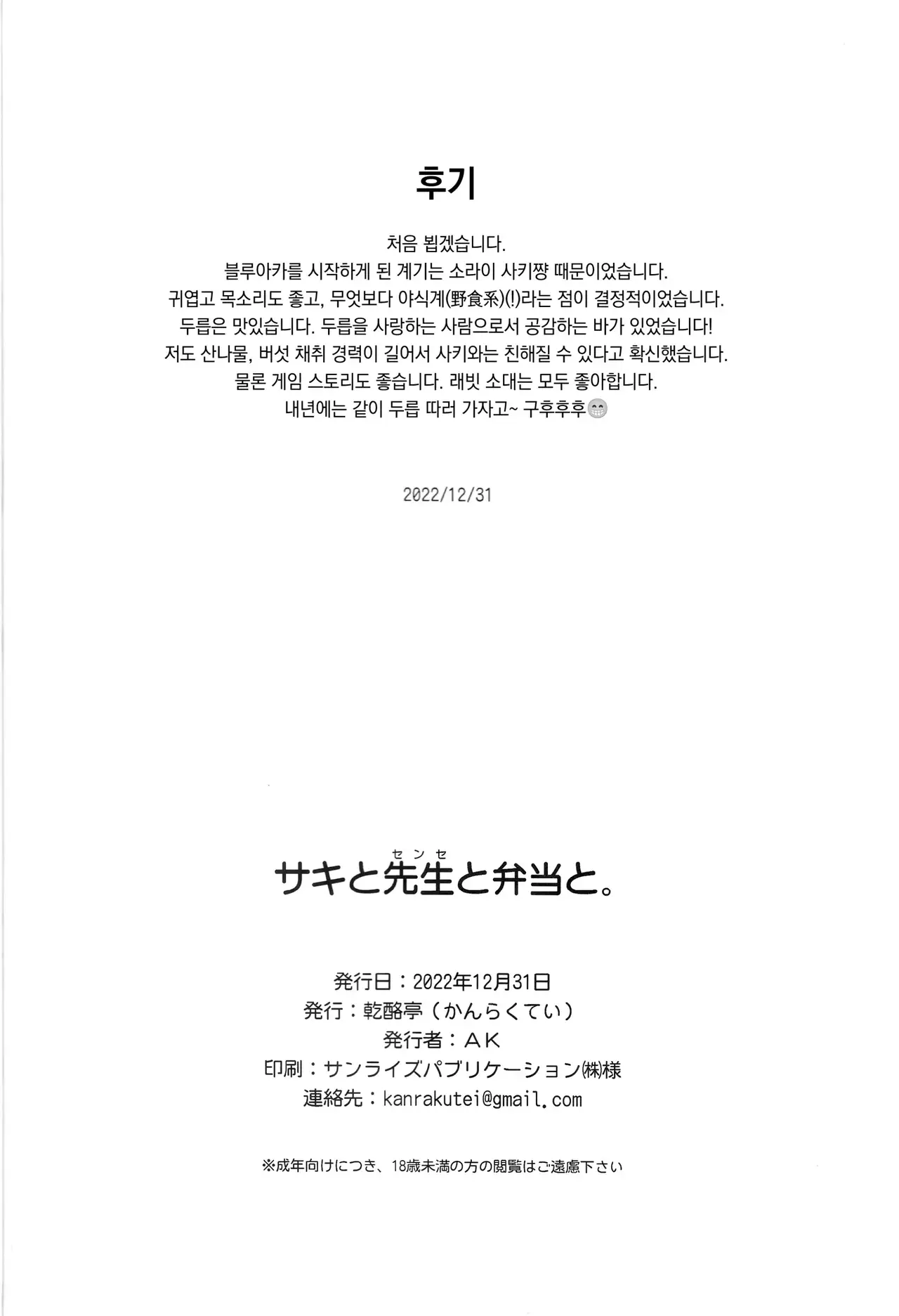 (C101) [乾酪亭 (AK)] サキと先生と弁当と。 (ブルーアーカイブ) [韓国翻訳]